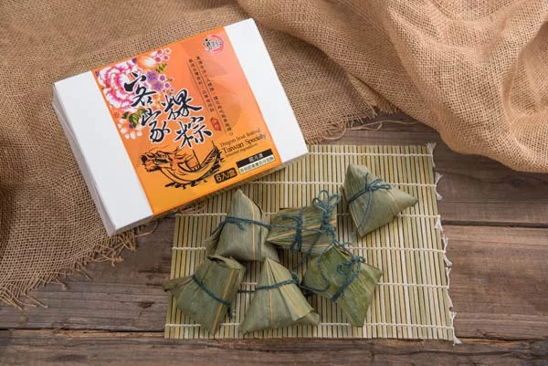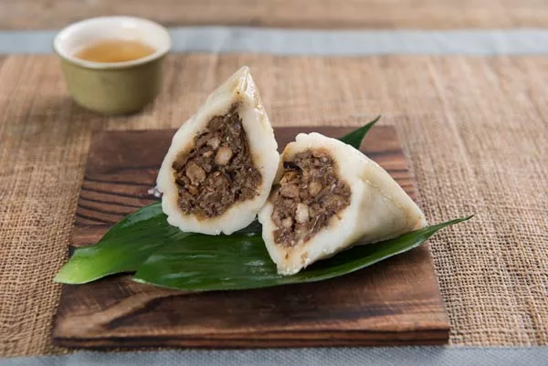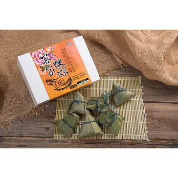 經大火爆炒而成。軟Q的糯米粉包裹著濃郁的內餡炒料,一起包入粽葉中蒸熟,吃一口就知道這是道地的客家風味。